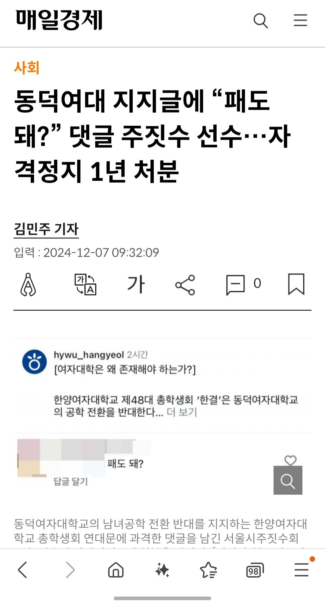 동덕여대 지지글에 “패도 돼?” 댓글 주짓수 선수…자격정지 1년 처분