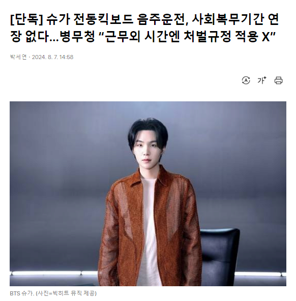 다만 슈가의 이번 혐의가 현재의 사회복무요원 근무에는 별다른 영향을 미치지 않을 것으로 보인다. 공식 근무시간이 아닌 때 벌어진 일이기 때문이다. 이와 관련해 병무청 관계자는 일간스포츠에 “근무시간 중의 업무부실 등에 대해서는 신분상의 조치를 받지만 근무시간 외 일은 일반 형법의 적용을 받는다”고 설명했다.