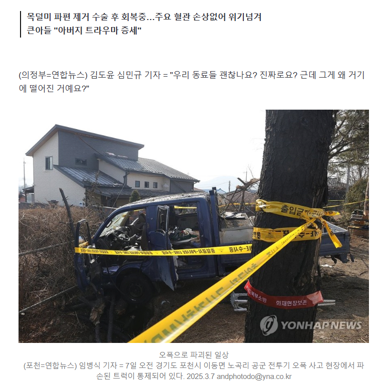 이어 "아버지는 사고 이후 불안감을 계속 보인다"며 "오랫동안 가족들이 이 마을에 살았지만, 이런 사고는 처음이다. 군 당국이 정확한 사고 원인을 밝히고 재발 방지 대책을 철저히 마련해줬으면 한다"고 강조했다.