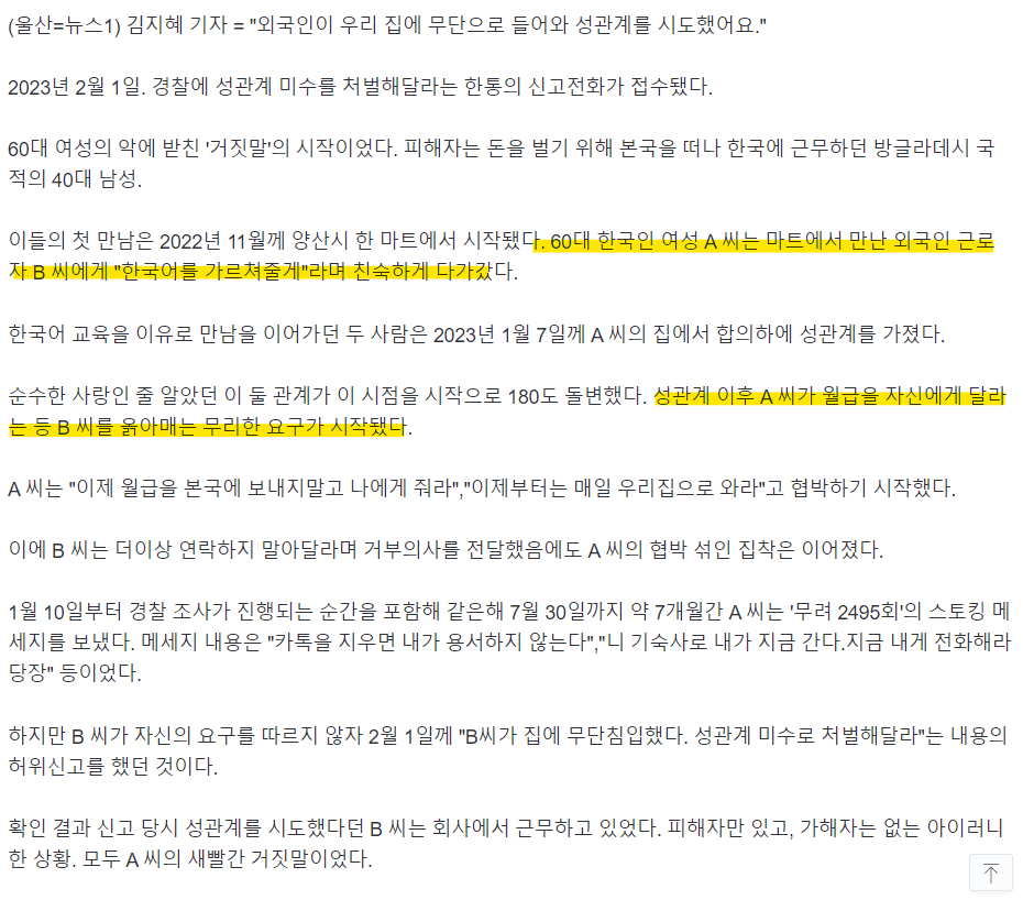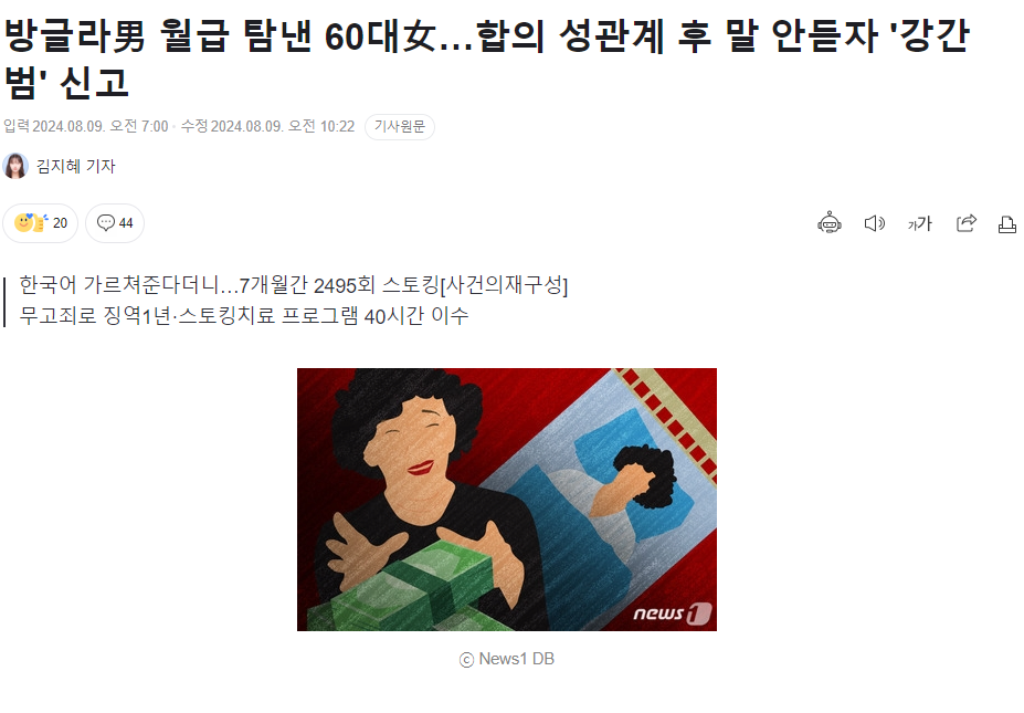 방글라男 월급 탐낸 60대女…합의 성관계 후 말 안듣자 '강간범' 신고