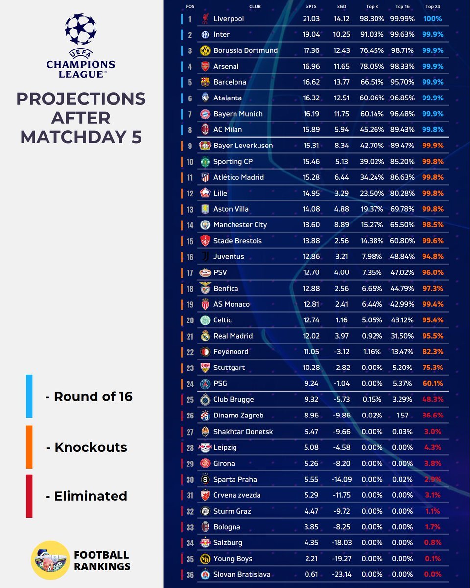 챔스) 16강 직행 확률 + 예상 최종 순위