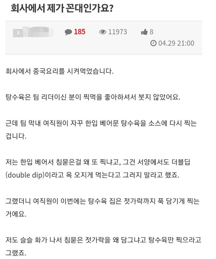 회사 여직원 한입 배어문 탕수육 찍먹 때문에 화난 남자.jpg