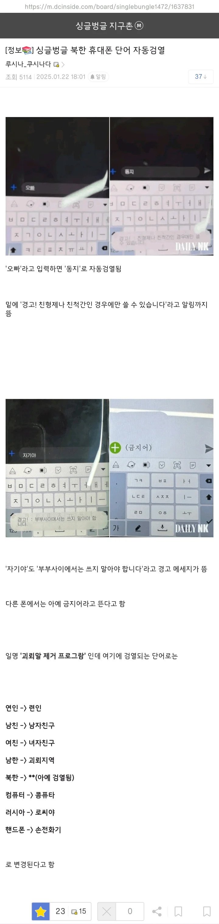 북한 휴대폰 단어 자동검열