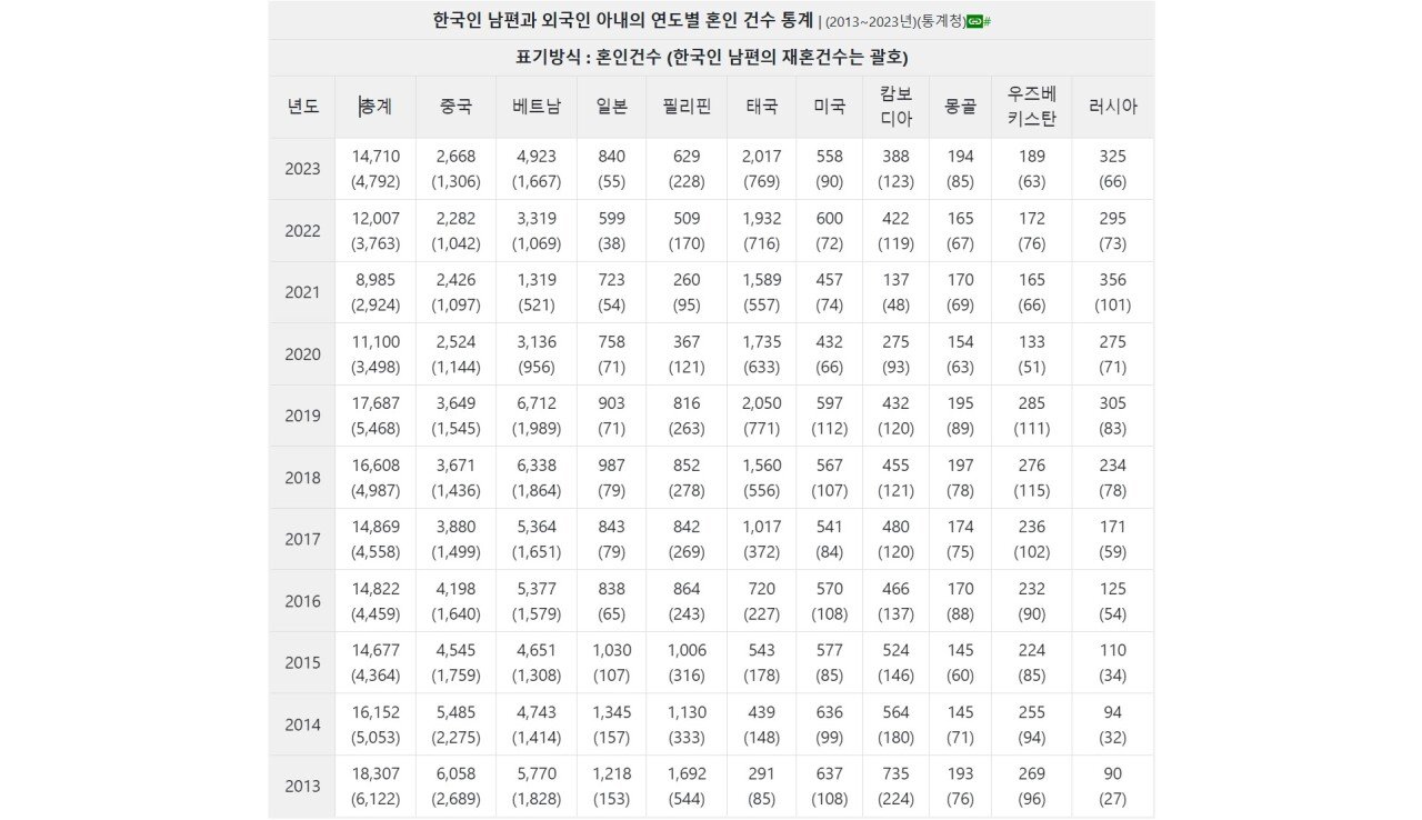 한국남자들과 국제결혼한 외국 여자들 국적 순위 최신판