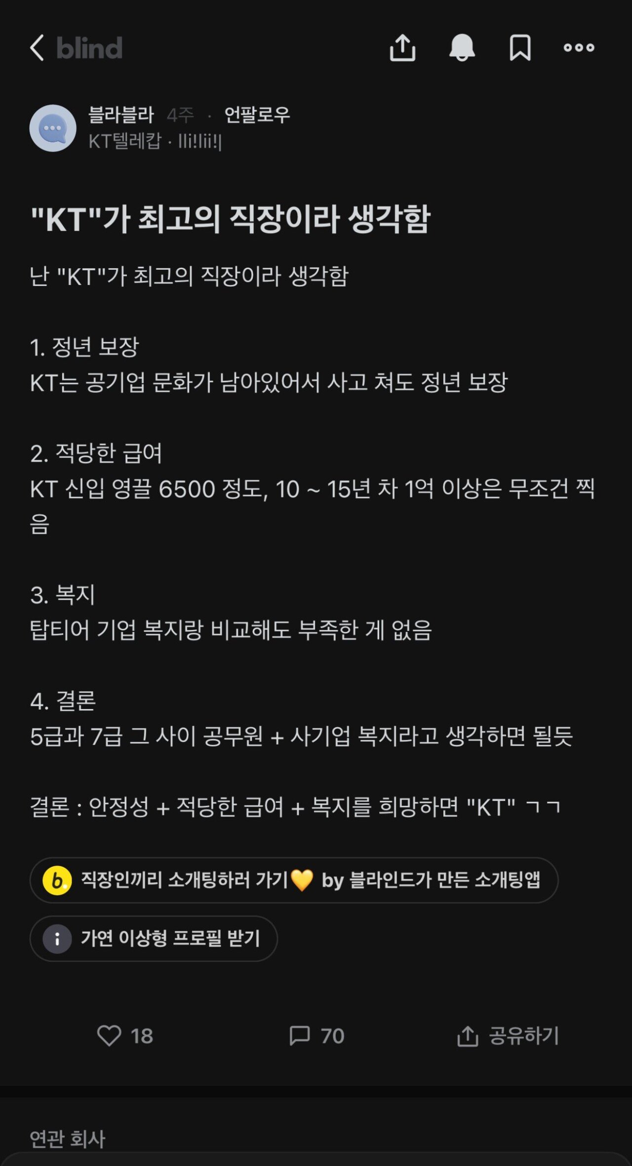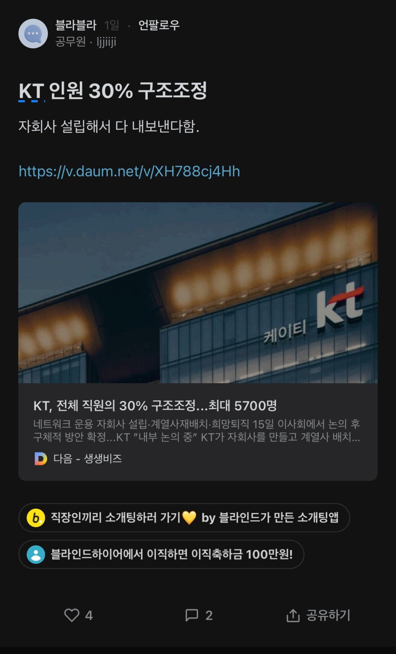 블라)KT구조조정 2주전에 올라온 글