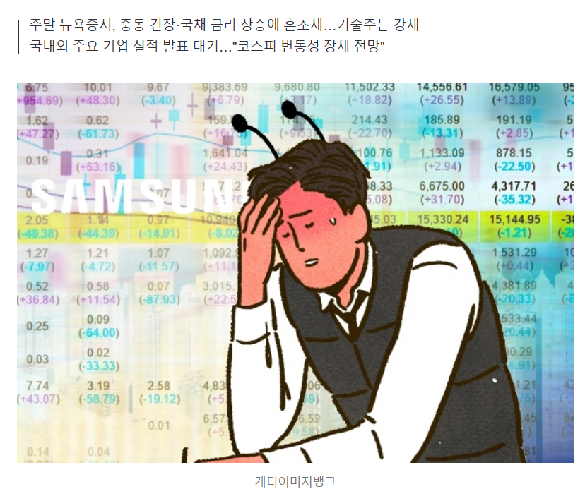 28일 국내 증시는 대내외 주요 기업 실적과 미국 국채 금리 상승 등을 주시하면서 경계감이 커질 것으로 전망된다. 이런 가운데 삼성전자 주가가 지난주 5만6000원선이 무너지면서 개미들이 한숨이 깊어지고 있다.