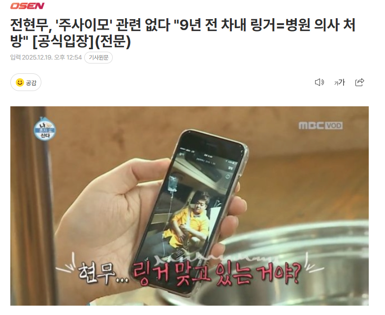 거론되고 있는 장면은 2016년 ‘나 혼자 산다’ 방송분입니다. 전현무는 당시 목 상태가 좋지 않아, 병원에서 담당 의사의 진료와 처방을 받아 치료를 받았습니다. 촬영 일정까지 시간이 충분하지 않아 의사의 판단 하에 부득이하게 이동하며 처치를 마무리하는 과정의 일부가 방송에 노출된 것입니다.