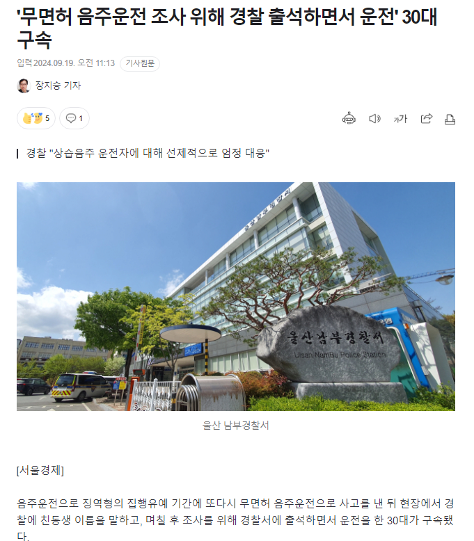 '무면허 음주운전 조사 위해 경찰 출석하면서 운전' 30대 구속