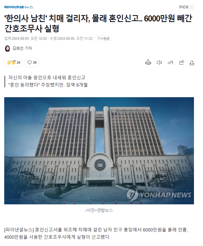 '한의사 남친' 치매 걸리자, 몰래 혼인신고.. 6000만원 빼간 간호조무사 실형