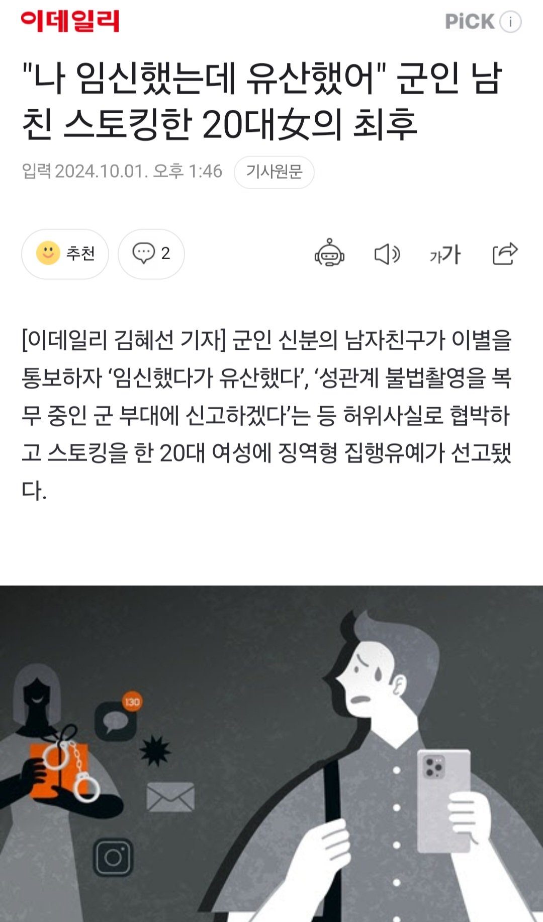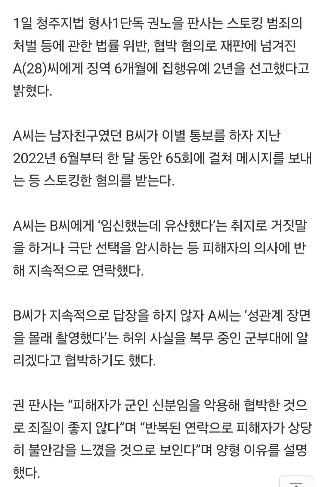 "나 임신했는데 유산했어" 군인 남친 스토킹한 20대女의 최후