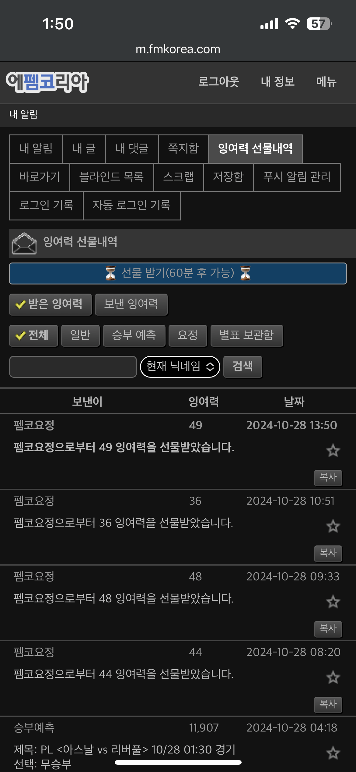 내정보 - 잉여력 선물내역에 들어가면 광고보고