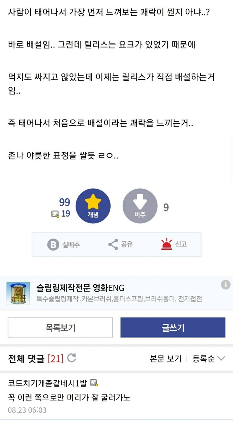 설명) 원피스 등장인물 닥터 배가펑크는 분신이 여럿 있어서 각자 역할을 나누어 수행하는데 하나 빼고 분신 다 죽거나 링크 끊김. 문제는 배변활동 담당하는 애도 링크 끊겨서 남은 한명은 생애최초로 응가 시작하게 됨
