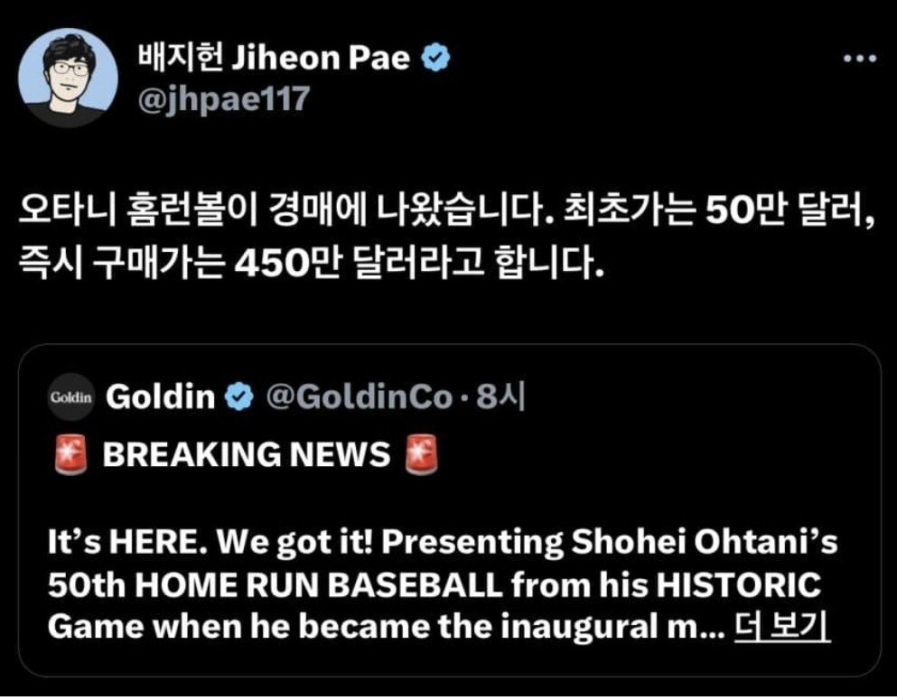 오타니 50-50 홈런볼 경매 시작 ㄷㄷㄷ