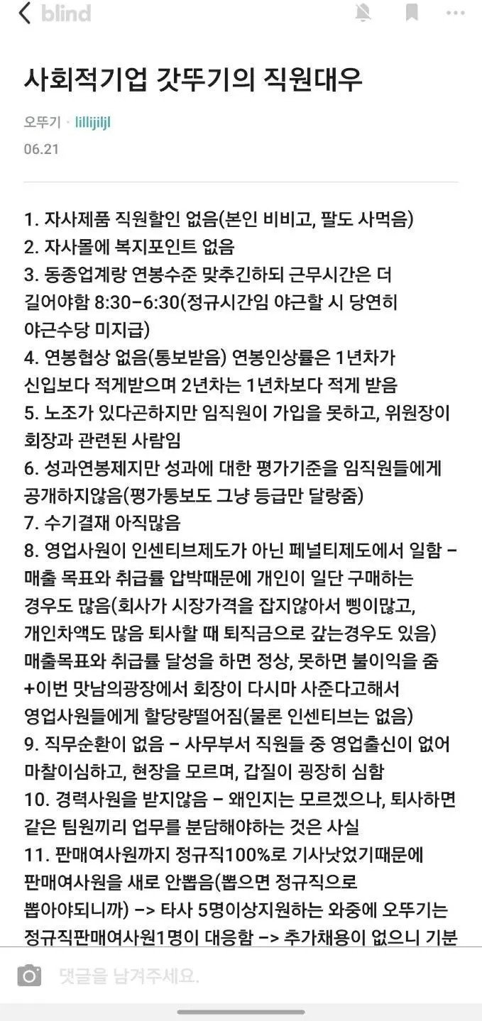 사회적 기업 갓뚜기의 직원 대우