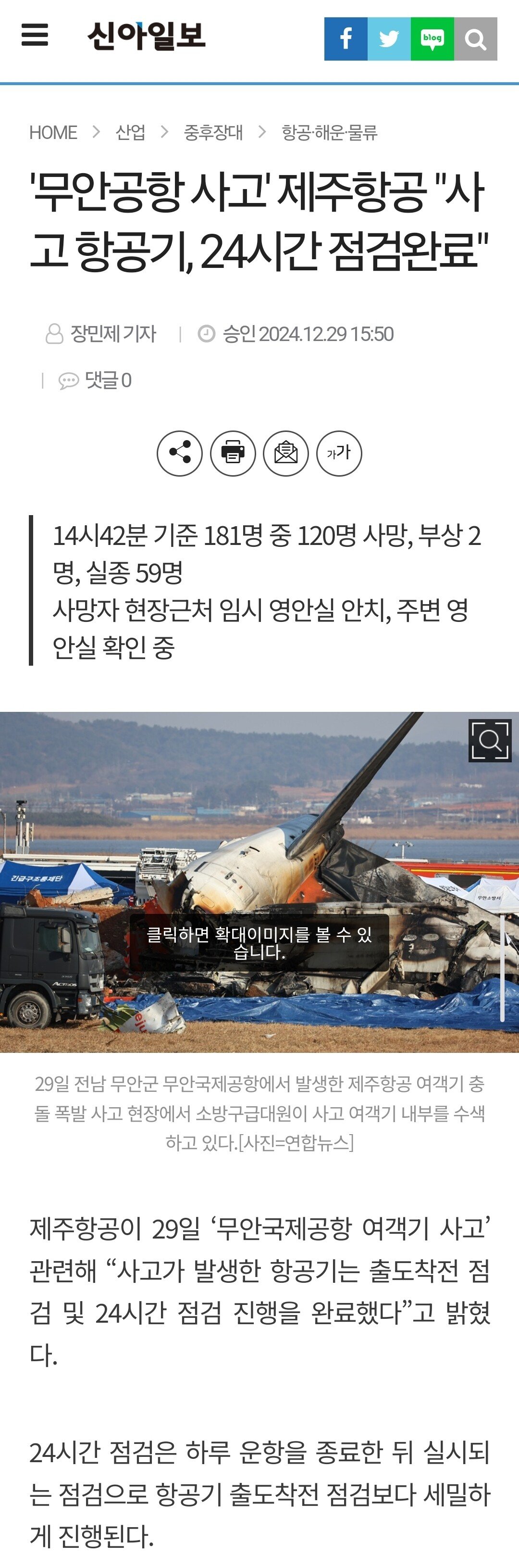 '무안공항 사고' 제주항공 "사고 항공기, 24시간 점검완료"