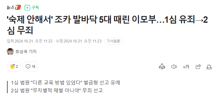 '숙제 안해서' 조카 발바닥 5대 때린 이모부…1심 유죄 2심 무죄