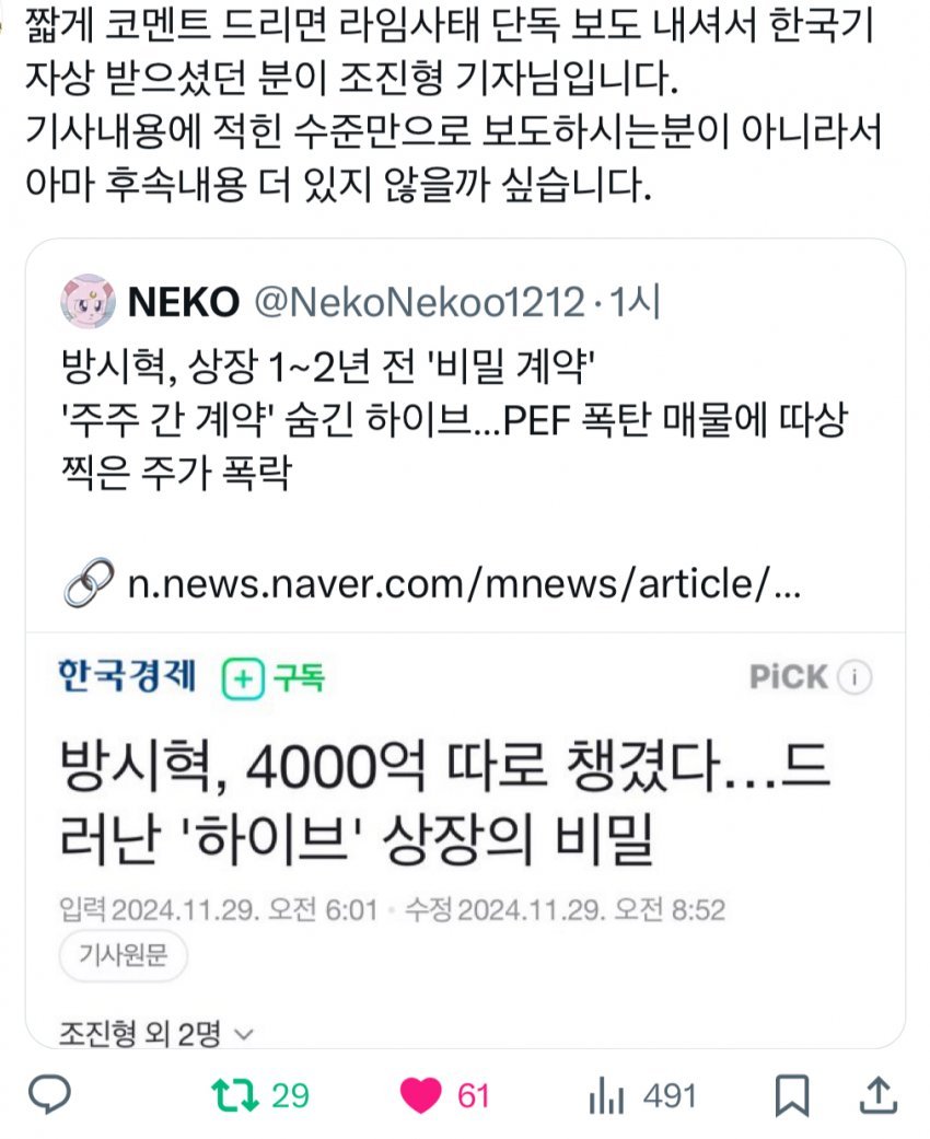 오늘 한경 방시혁 4000억 기사 낸 기자 정보