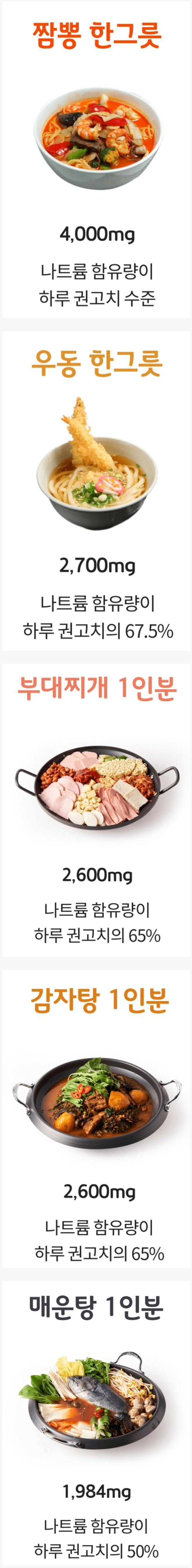 대한당뇨병학회 제시 권고치4,000mg(소금 국내10g, 미국 5g )신장합병증 있다면 절반으로 줄여야함당뇨병 있다면 고혈압 발생위험도12.6배 증가