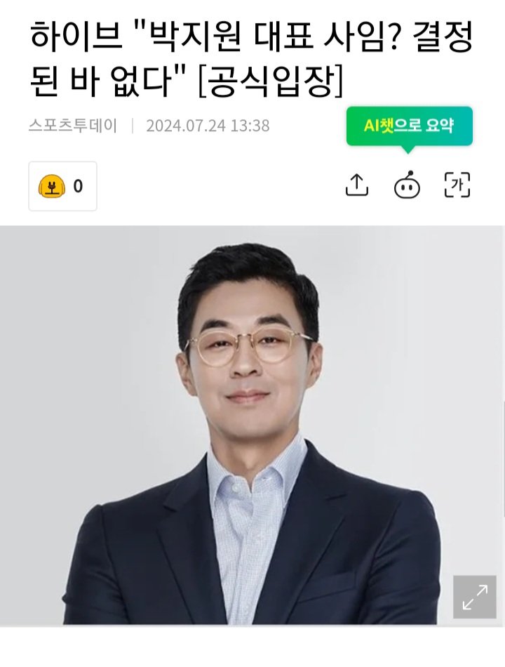 하이브 "박지원 대표 사임? 결정된 바 없다"