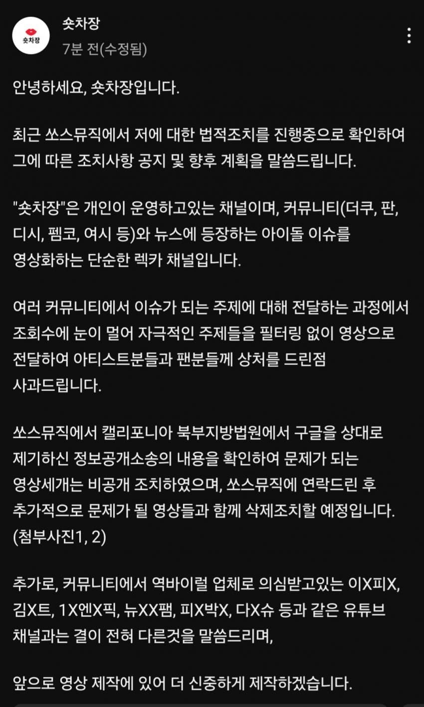 고소당한 렉카 숏채널 사과문 작성 후 행보