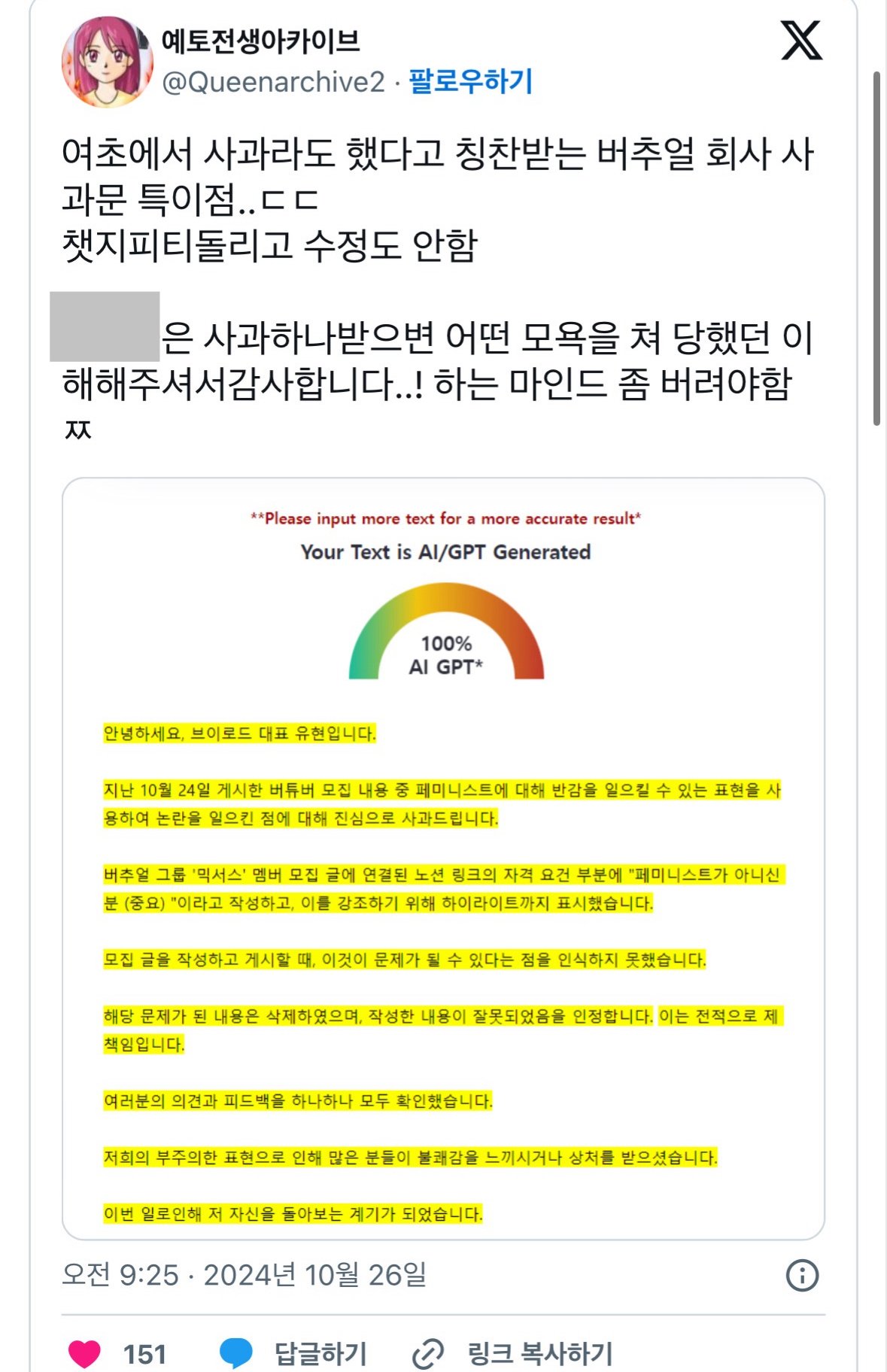 포텐간 버츄얼 페미 사과문이 챗 지피티 100%라는 X녀