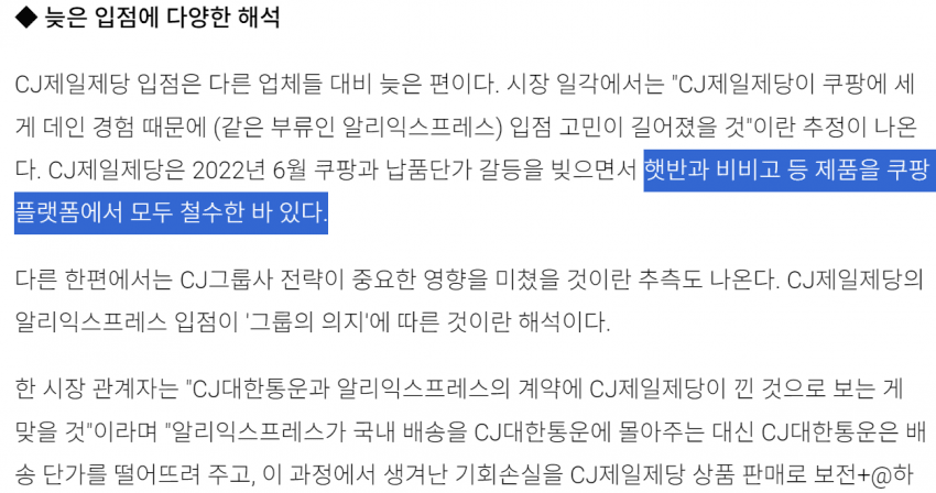 cj제일제당은 쿠팡하고 수수료문제때문에 크게 싸워서 얼마전에 공식 스토어 쿠팡에서 없애는 초강수를 둠... 쿠팡에서 햇반 보이긴한데 cj공식계정이 아님