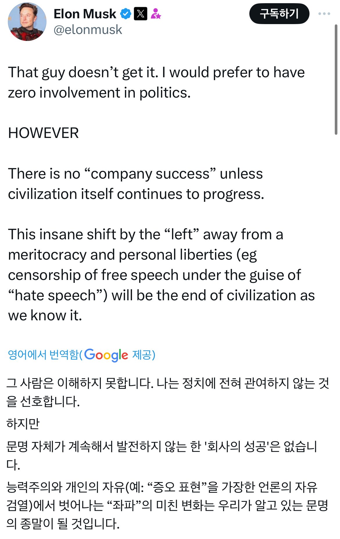 머스크에게 있어선 화성을 개척하거나, starlink를 설치하는 것처럼 PC의 폭주를 막는 것이 인류의 진보를 위한 것이라네 ㅋㅋㅋㅋ