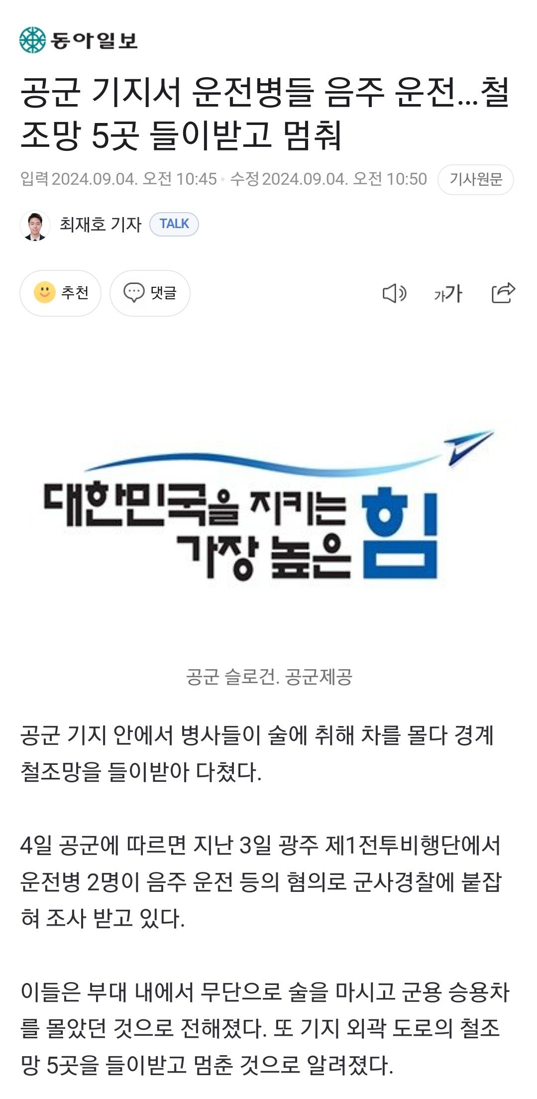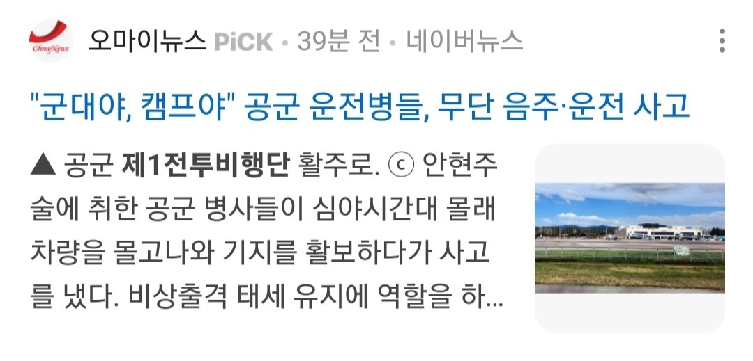 제1전투비행단에서 운전병들이 밤에 술마시고 관용차를 무단으로 끌고서 외곽도로를 100km로 달리다가 철조망 5개 부쉈다고 올라옴