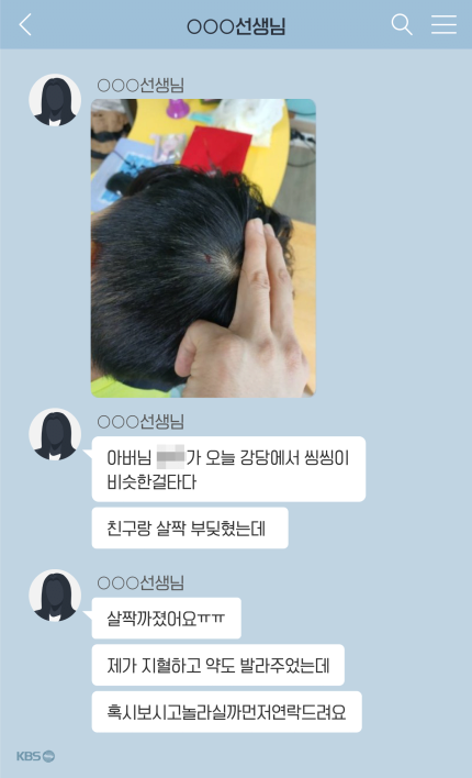 선생님은 약도 잘 발라주고, 이제는 친구와 잘 놀고 있다며 사진까지 보내줬습니다. "왜 병원에 보내지 않았느냐?" 따졌지만, 그 정도로 다치진 않았다며, 부모님을 안심시켰습니다.