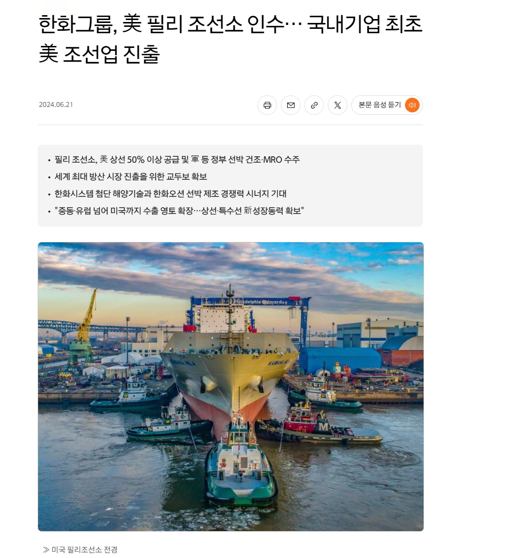 유튜브에 미 군함이 조선소에서 나가는게 떠서 봤더니 한화가 인수한 곳임 ㅋㅋ
