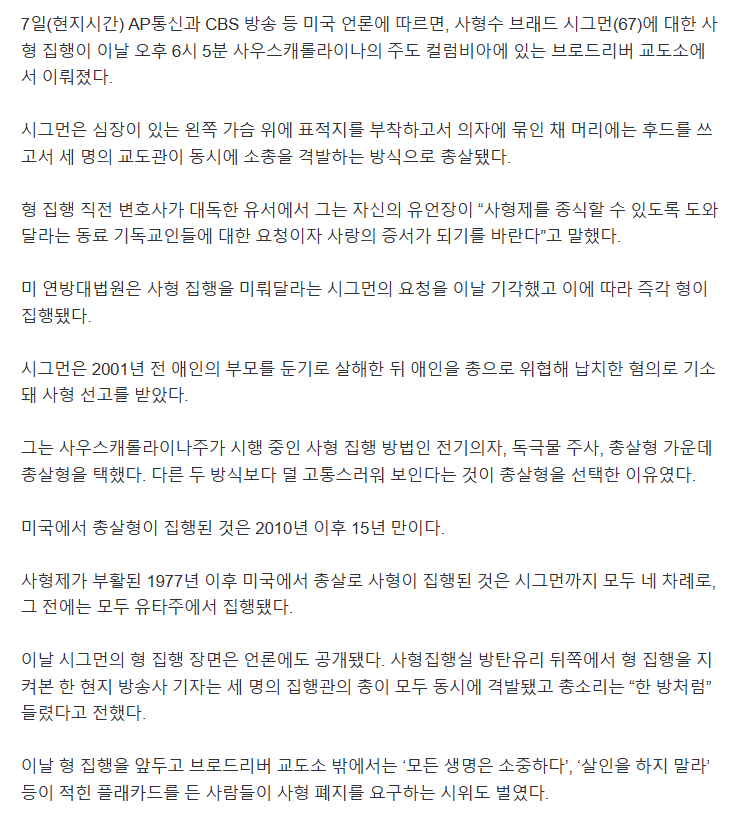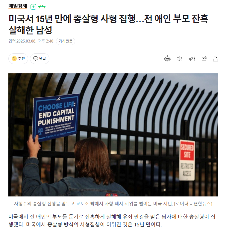 미국서 15년 만에 총살형 사형 집행... 전 애인 부모 잔혹 살해한 남성