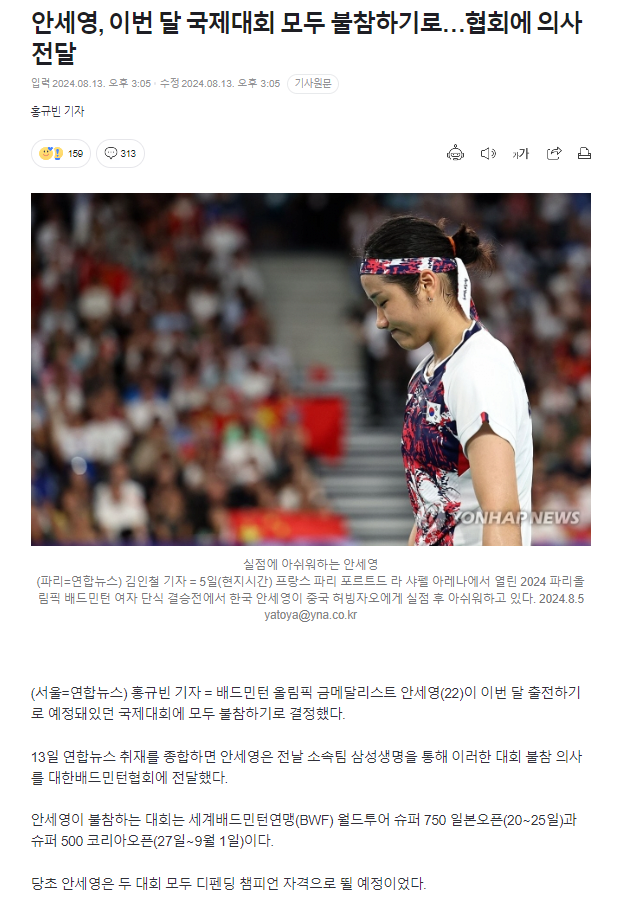 [배드민턴] 안세영 이번달 일본오픈, 코리아오픈 불참