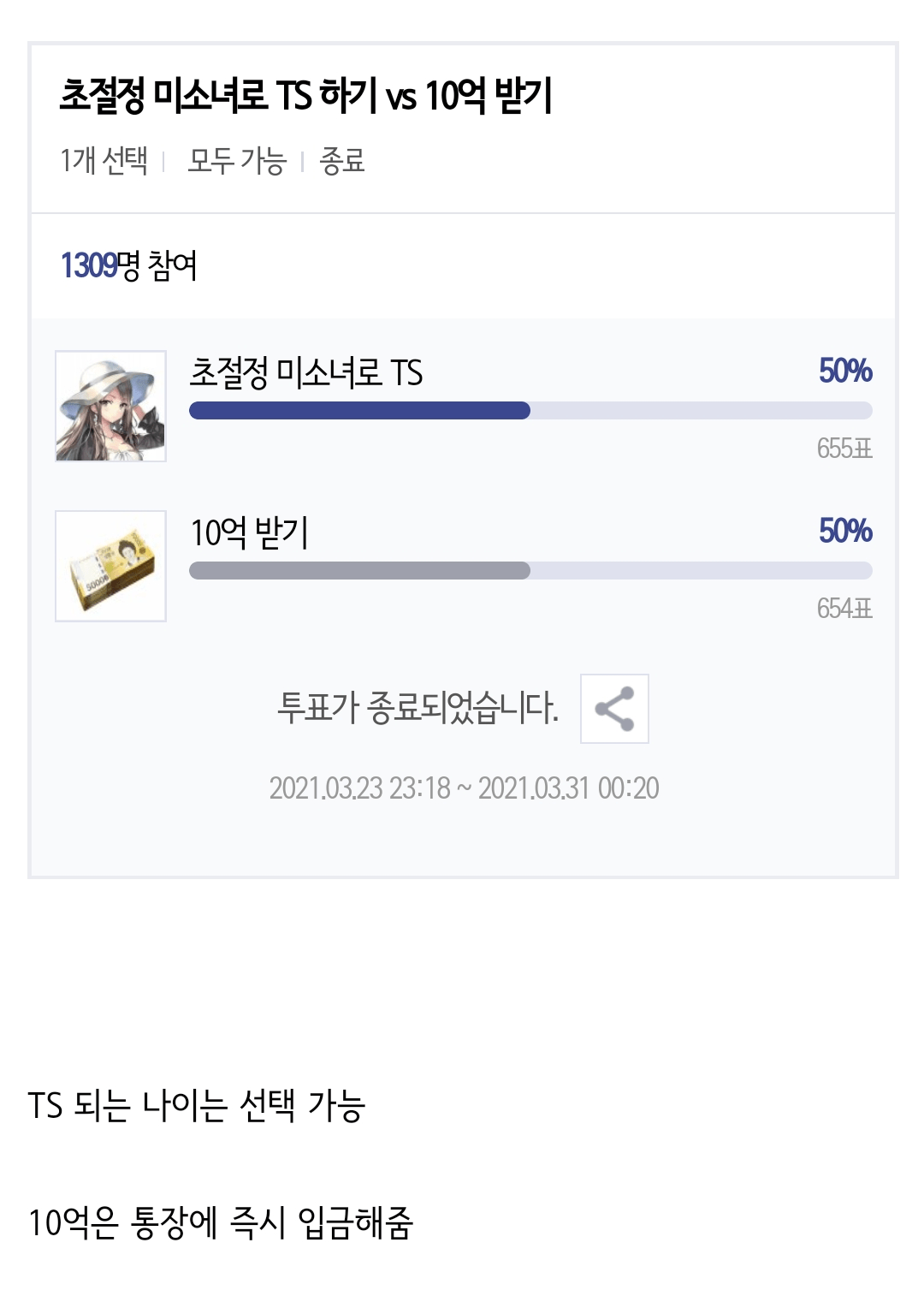 초절정 미소녀로 TS 하기 vs 10억 받기