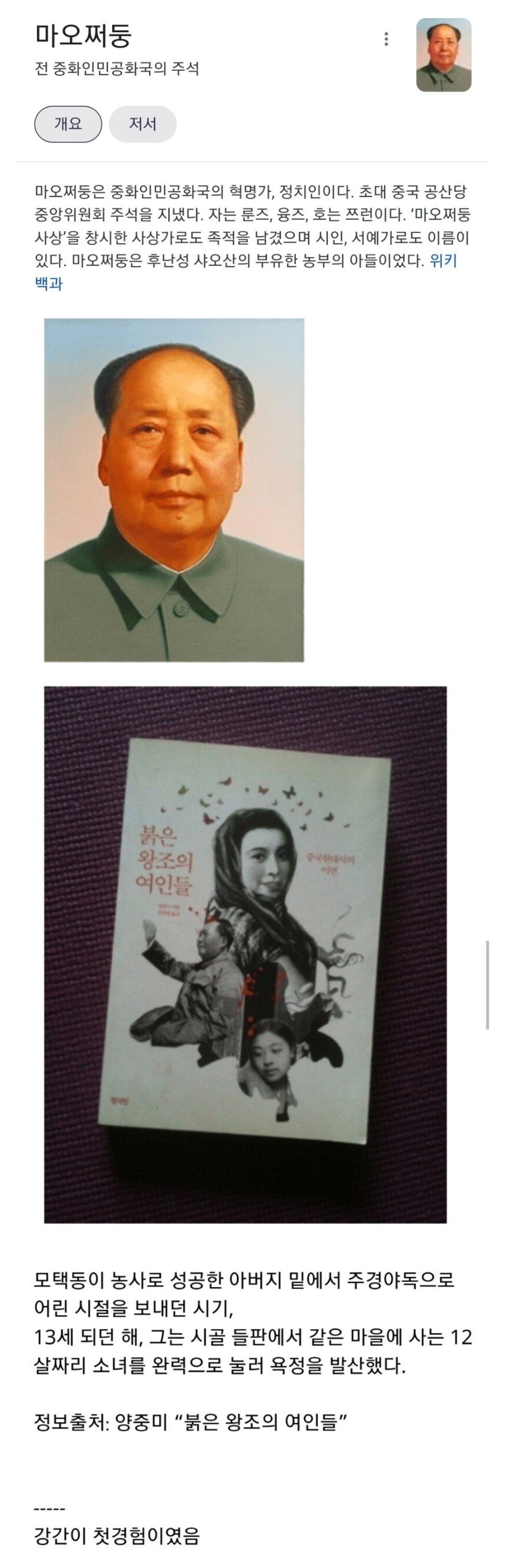 13살때 소녀를 겁탈한 마오쩌뚱