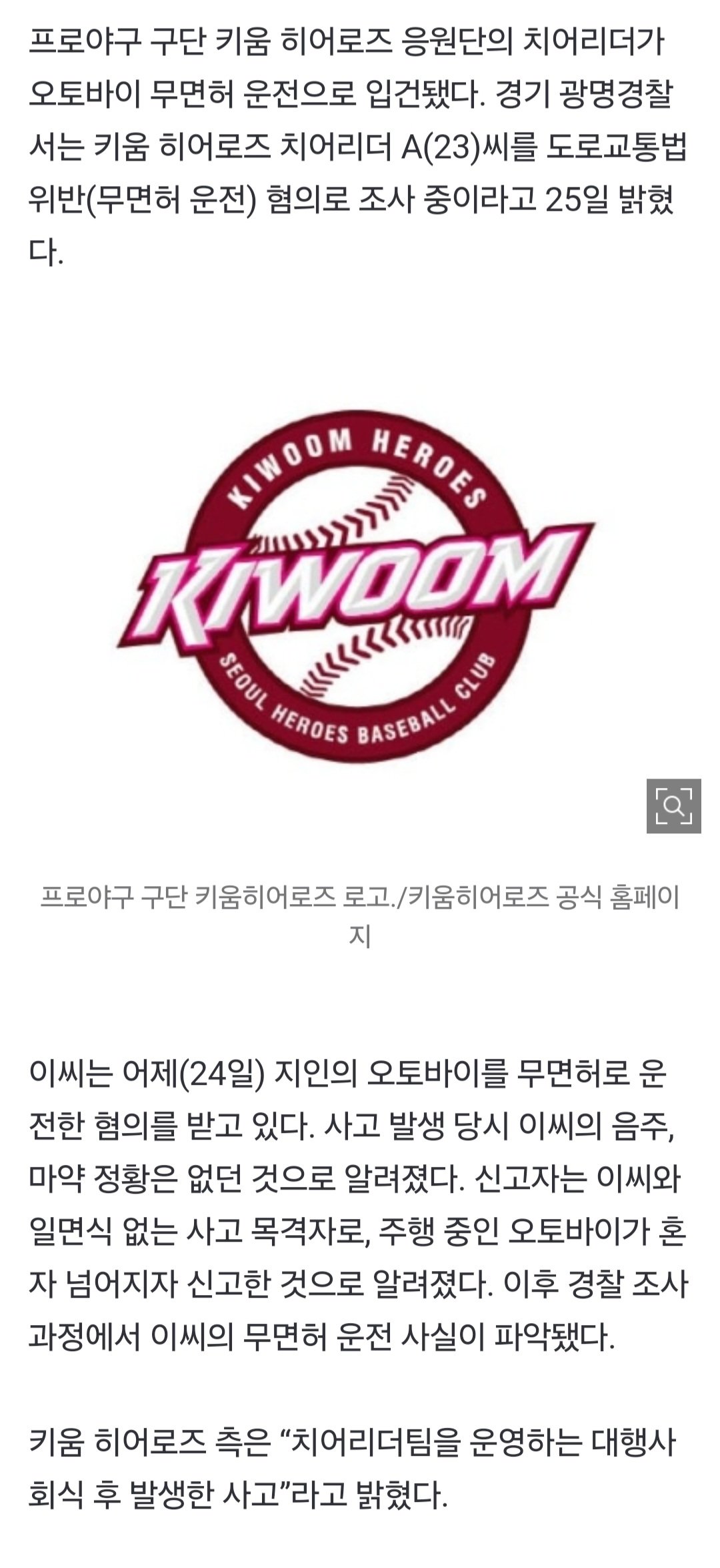 [단독] 키움 히어로즈 치어리더, 오토바이 무면허 운전으로 입건