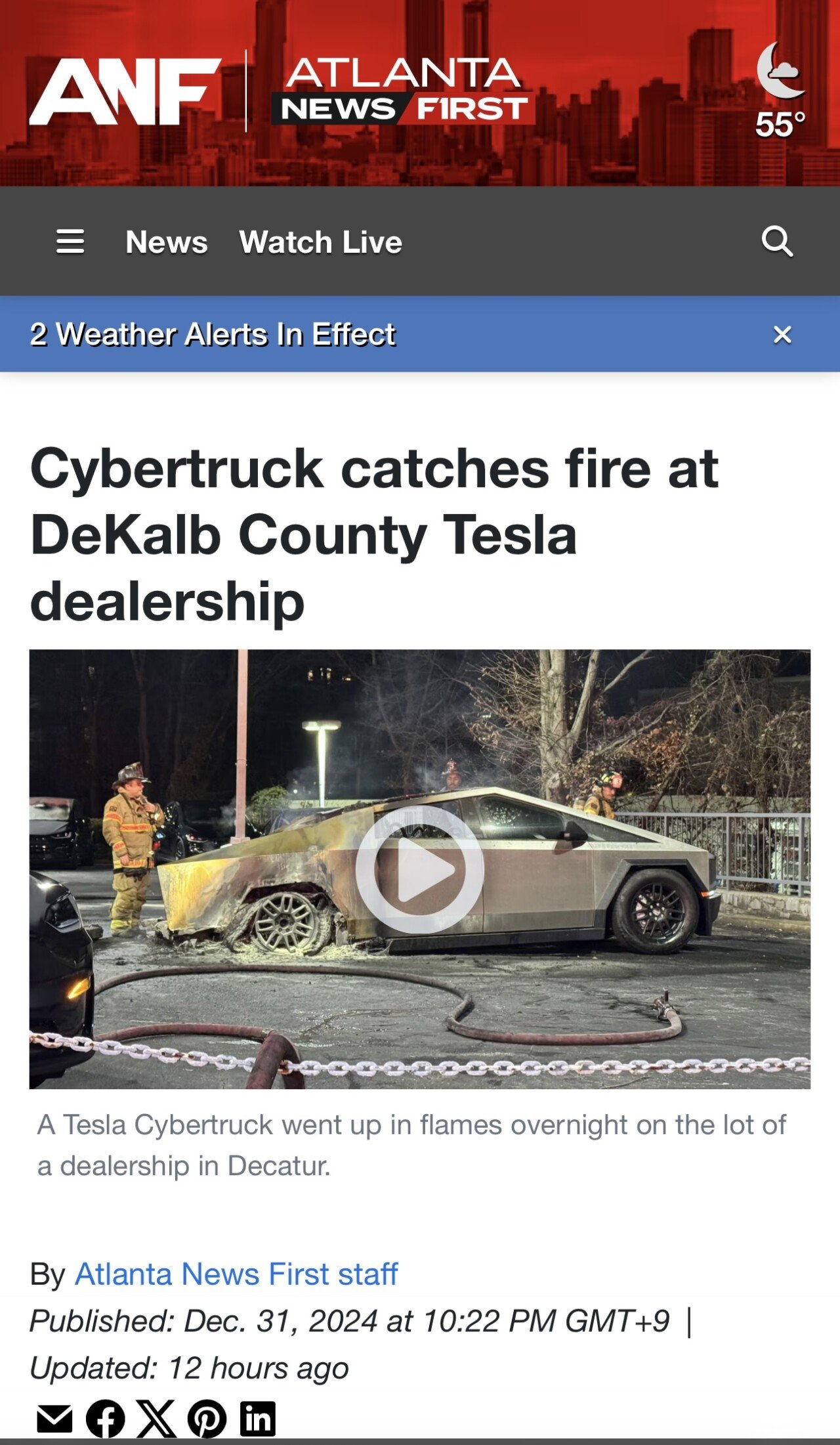 31일 미국 데칼브 카운티에서 주차된 사이버트럭이 전소되었음.