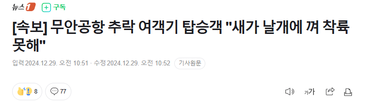 [속보] 무안공항 추락 여객기 탑승객 "새가 날개에 껴 착륙 못해"