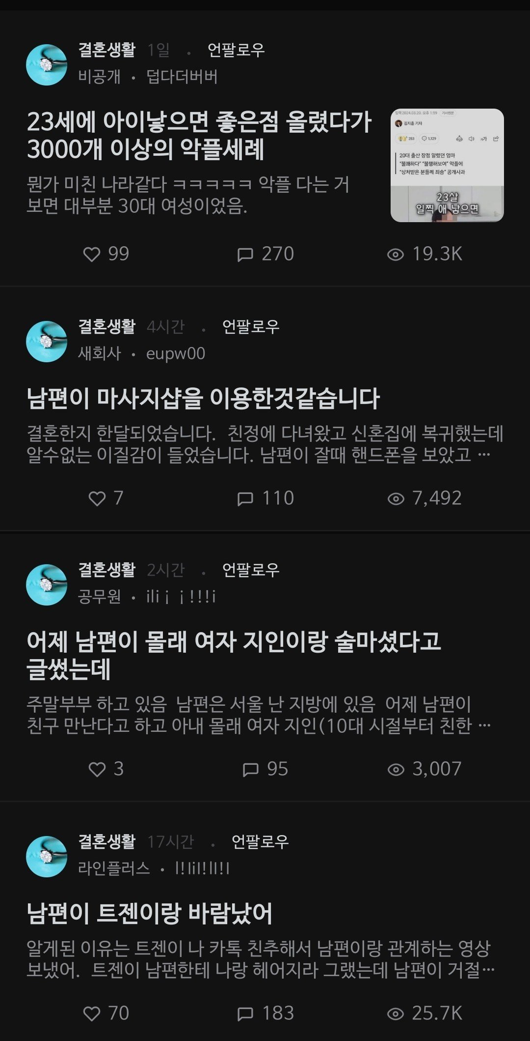 "남편이 마사지샵 방문, 여자 지인과 술자리, 트젠이랑 바람"