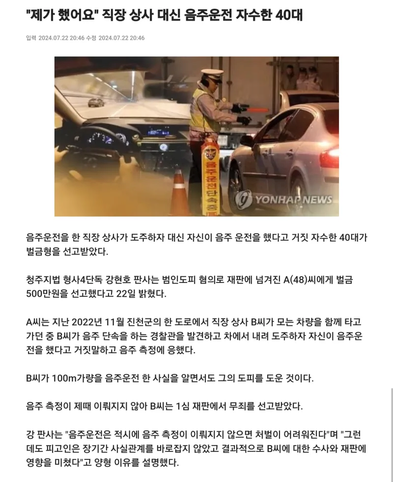 직장상사 대신 음주운전 자수한 40대의 최후.jpg