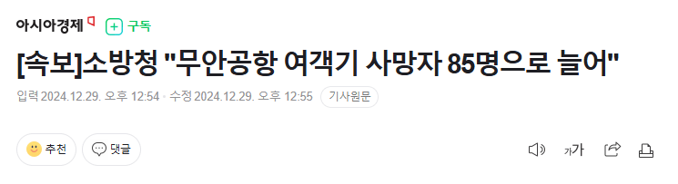 [속보]소방청 "무안공항 여객기 사망자 85명으로 늘어"