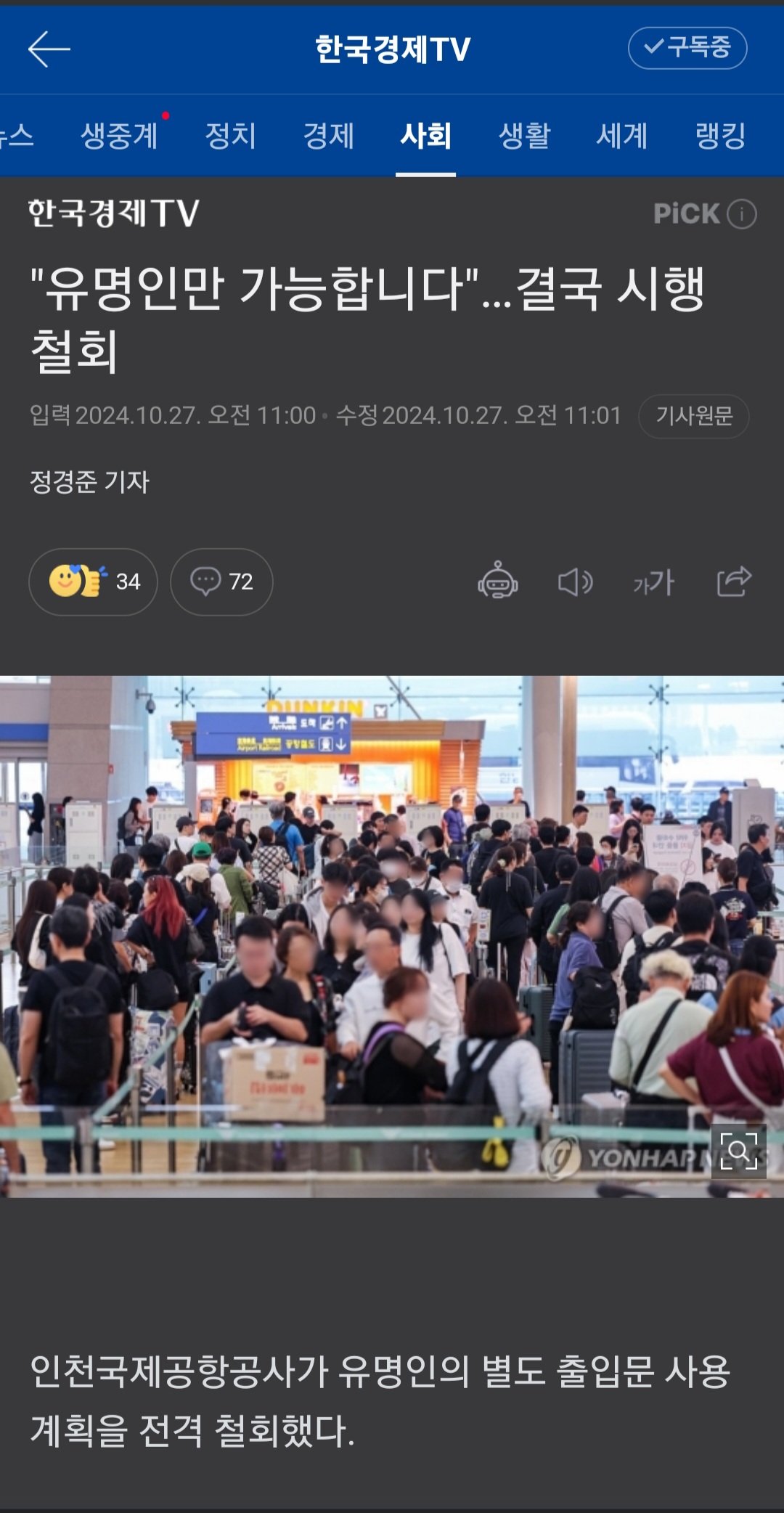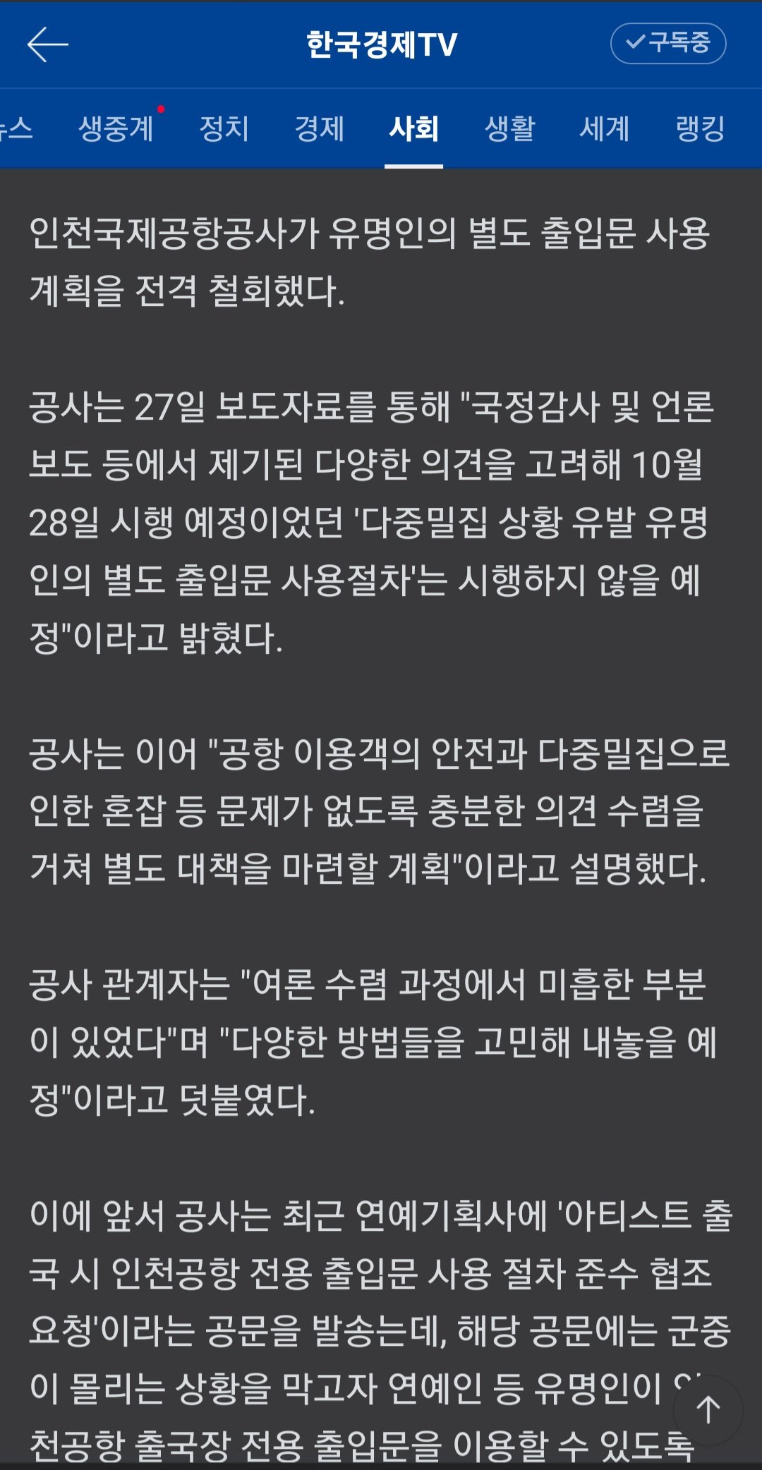 인천공항 연예인 별도 출입문 계획 철회
