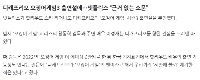 디캐프리오 오징어게임3 출연설에…넷플릭스 “근거 없는 소문”