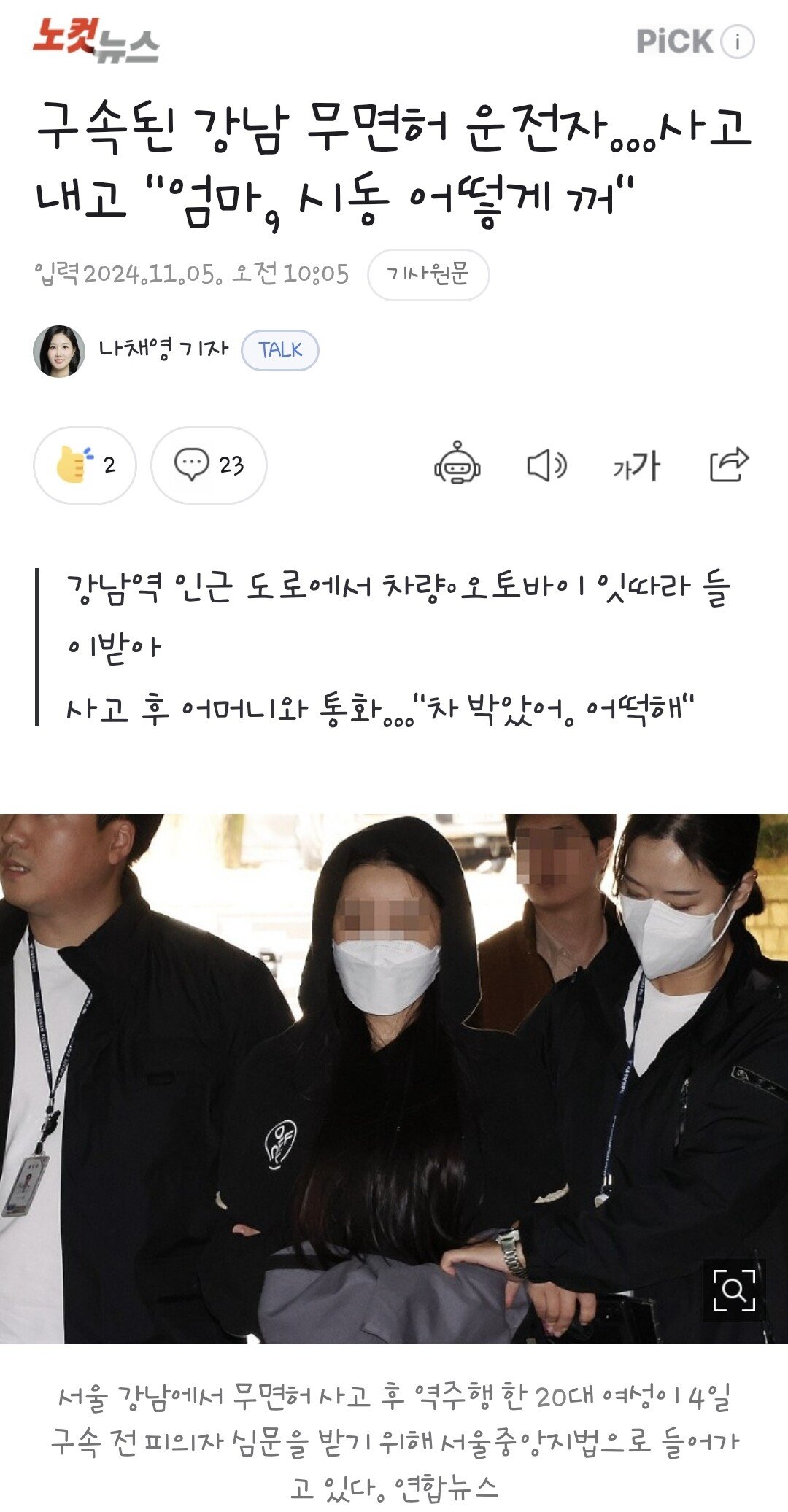 주말 서울 강남 한복판에서 8중 추돌사고를 낸 운전자가 구속됐다. 무면허 20대 여성 운전자가 사고 후 어머니와 통화한 내용에는 "시동끄는 걸 모른다"며 당황해하는 목소리가 그대로 담겼다.