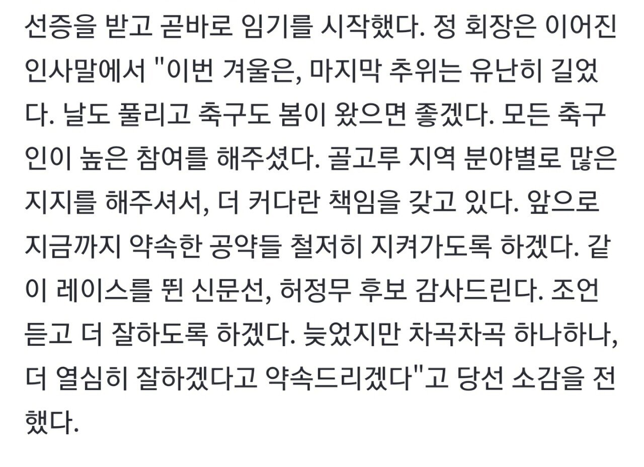 정몽규 당선 소감 : "이번 겨울은, 마지막 추위는 유난히 길었다. 날도 풀리고 축구도 봄이 왔으면 좋겠다."