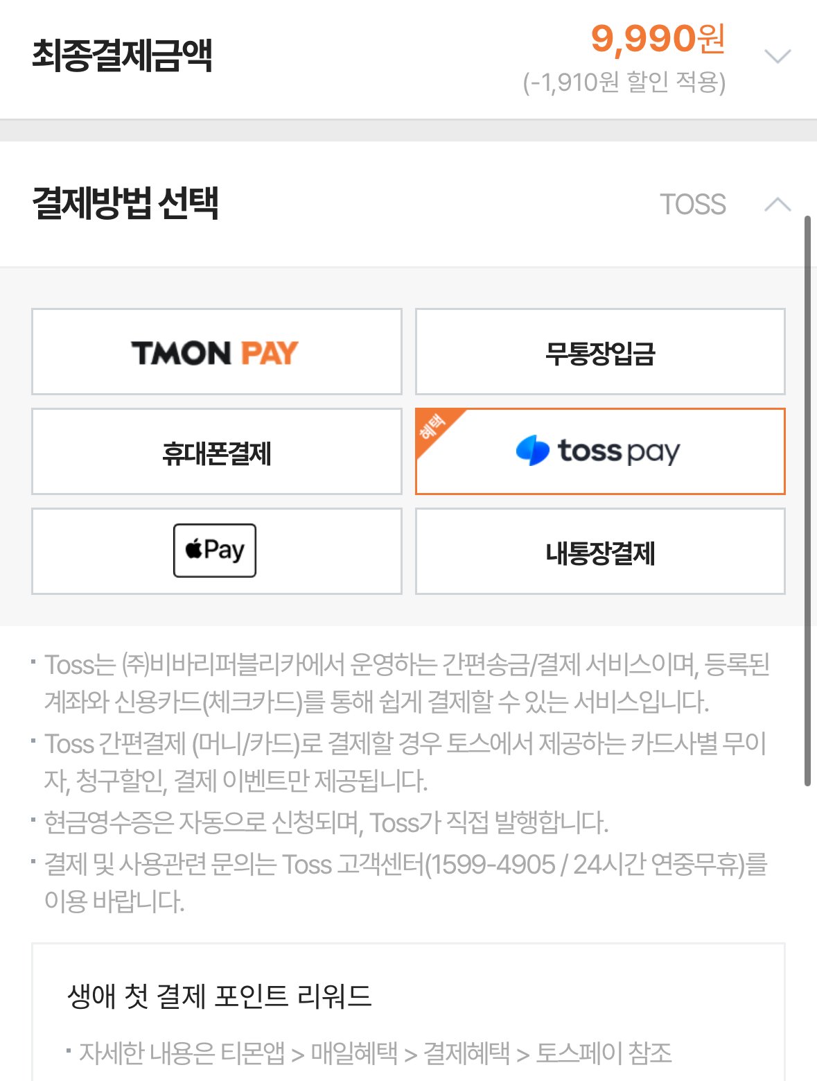 카드 결제 방식은 토스페이랑 애플페이만 남은 상태