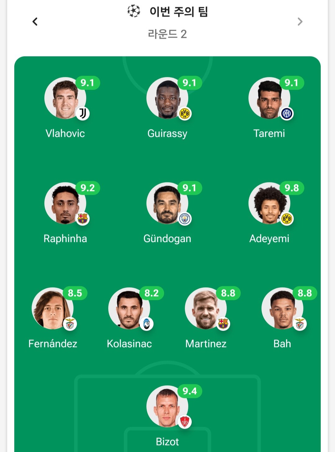 [Fotmob] 챔스 2라운드 이주의 팀