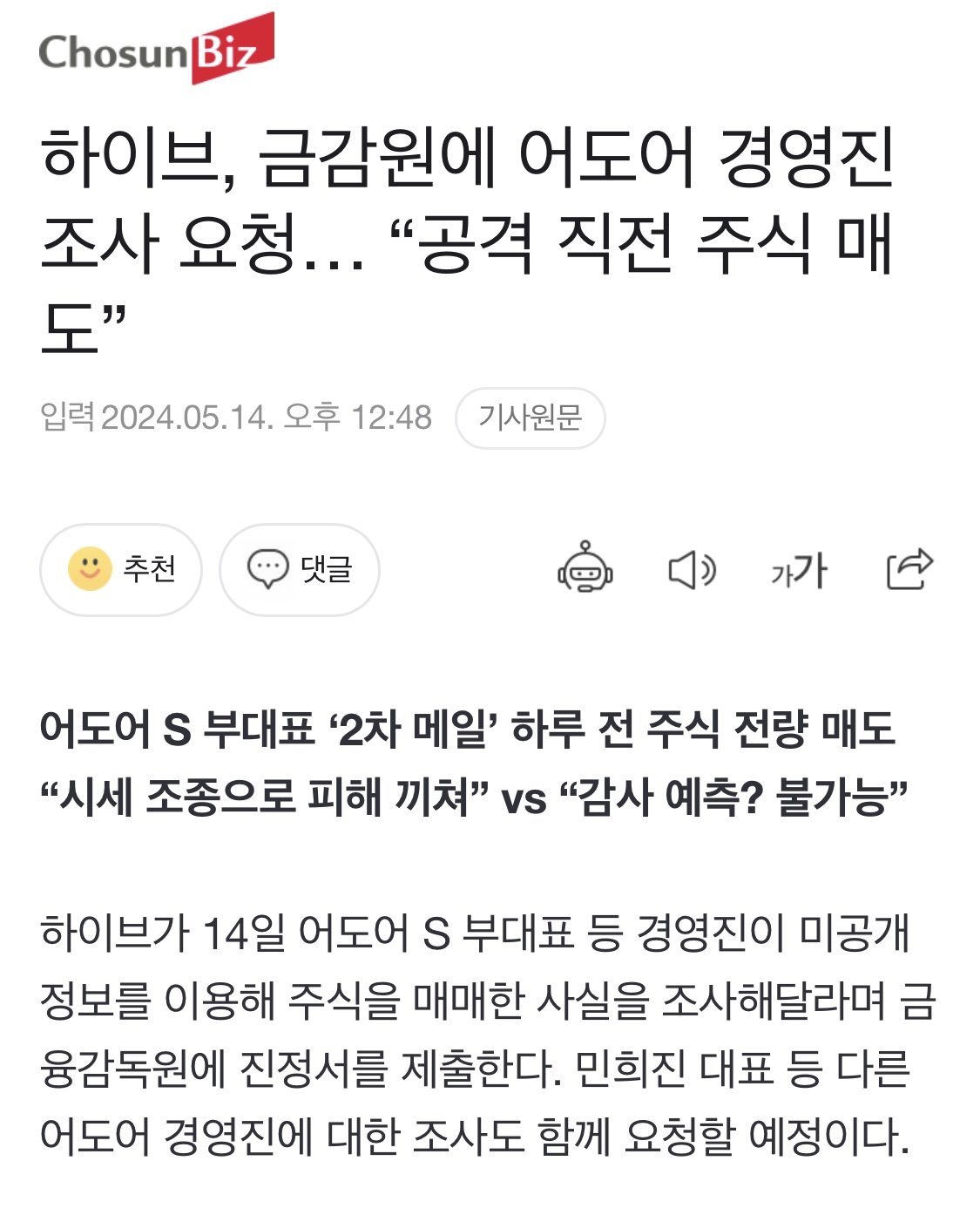 하이브는 감사 과정에서 민 대표 등이 명시적으로 주가가 떨어질 것을 사전에 인지하고 있다는 카카오톡 대화 내용도 확보해 증거로 제출할 방침이다.