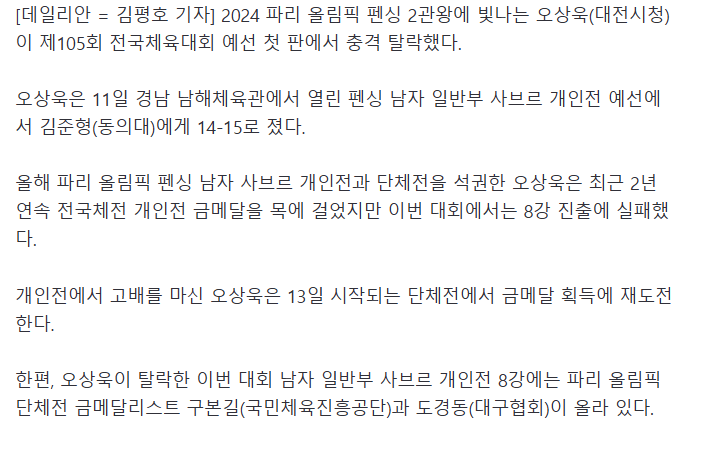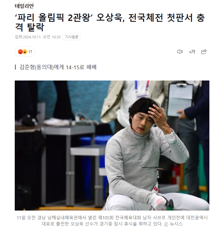 ‘파리 올림픽 2관왕’ 오상욱, 전국체전 첫판서 충격 탈락
