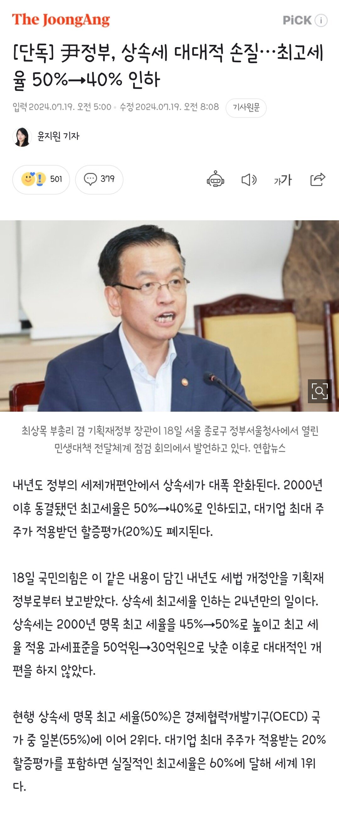 [단독] 尹정부, 상속세 대대적 손질…최고세율 50% -> 40% 인하