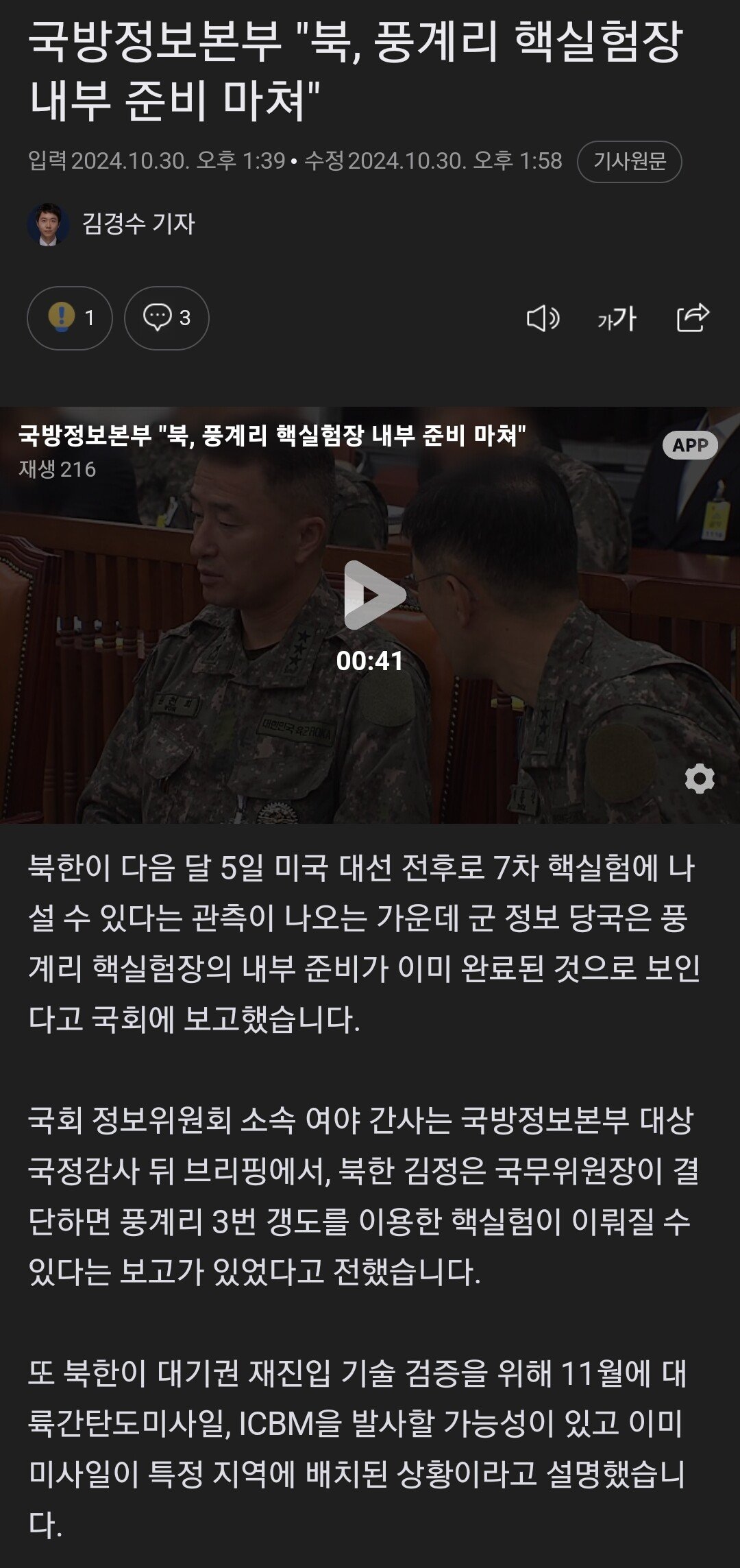 국방정보본부) 북 7차 핵실험 준비 완료!!